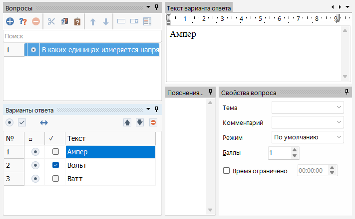 После того как Вы ввели текст вопроса и вариантов ответа, можно установить Свойства вопроса: