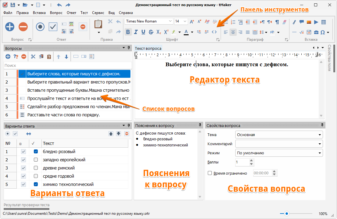 Эти три шага будут повторяться с добавлением каждого нового вопроса. Завершится работа сохранением созданных вопросов в файл теста с указанием его места расположения. Возможна детализация и настройка общих свойств теста (вызов окна нажатием F10).
