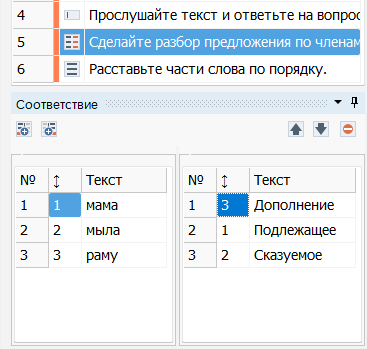 Правила составления вопросов данного типа. Сначала надо ввести левые части пар, затем правые и указать правильную позицию во втором столбце [↕] для каждого элемента. Например, для вышеприведенного соответствия варианты ответов нужно расположить как показано на рисунке 2.23.