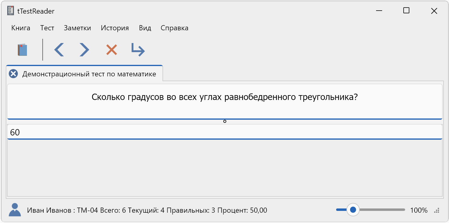 После ответа для перехода к следующему вопросу достаточно нажать клавишу Enter или щелкнуть по кнопке Следующий. На рисунке показан ответ пользователя, который ввел число 60.