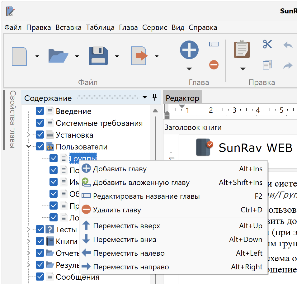 Разработка содержания осуществляется в одноименном поле, расположенном в левом верхнем углу окна программы. Создание и работа со структурой содержания осуществляется выбором соответствующей команды на вкладке Глава либо через контекстное меню при щелчке правой кнопкой мыши (ПКМ) в поле Содержание (рисунок 1).