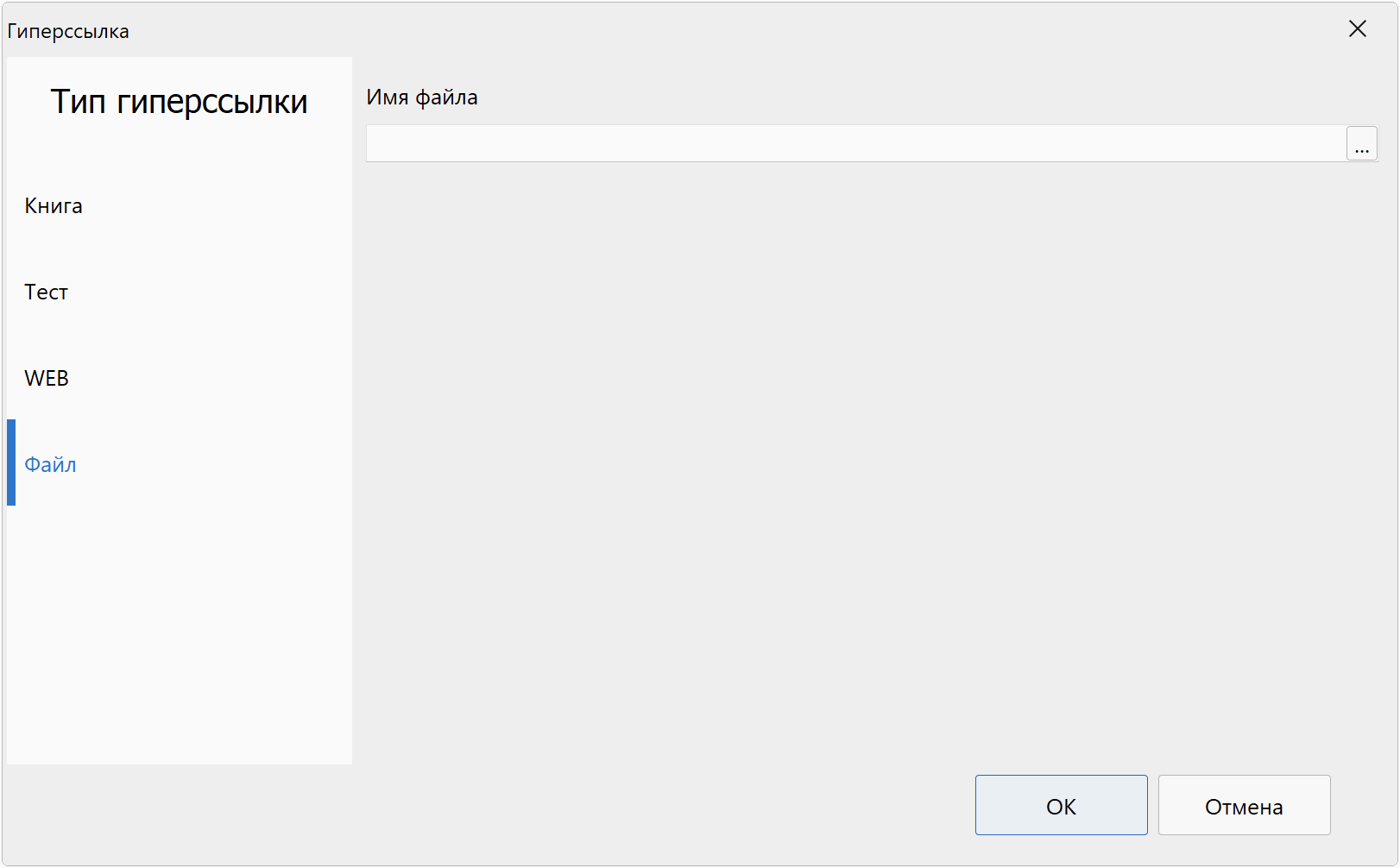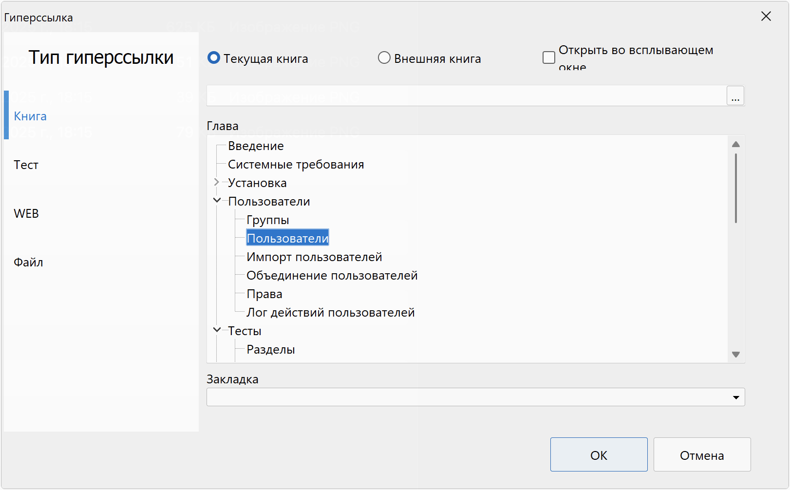 - выбрать Тип гиперссылки: Книга.